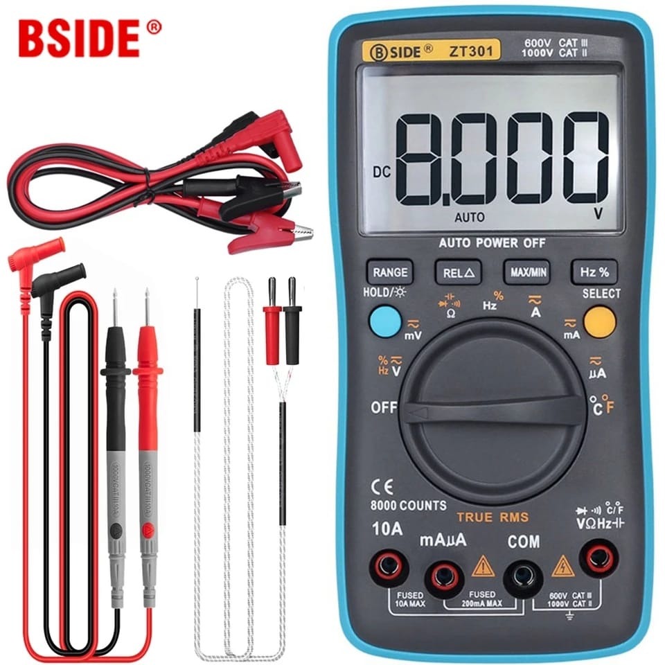 Автоматический мультиметр BSIDE ZT301 поможет измерять сопротивление, ёмкость, вольты, амперы, частоту, измерить температуру. Большой дисплей с подсветкой, резиновый защитный кожух, термодатчик в комплекте.