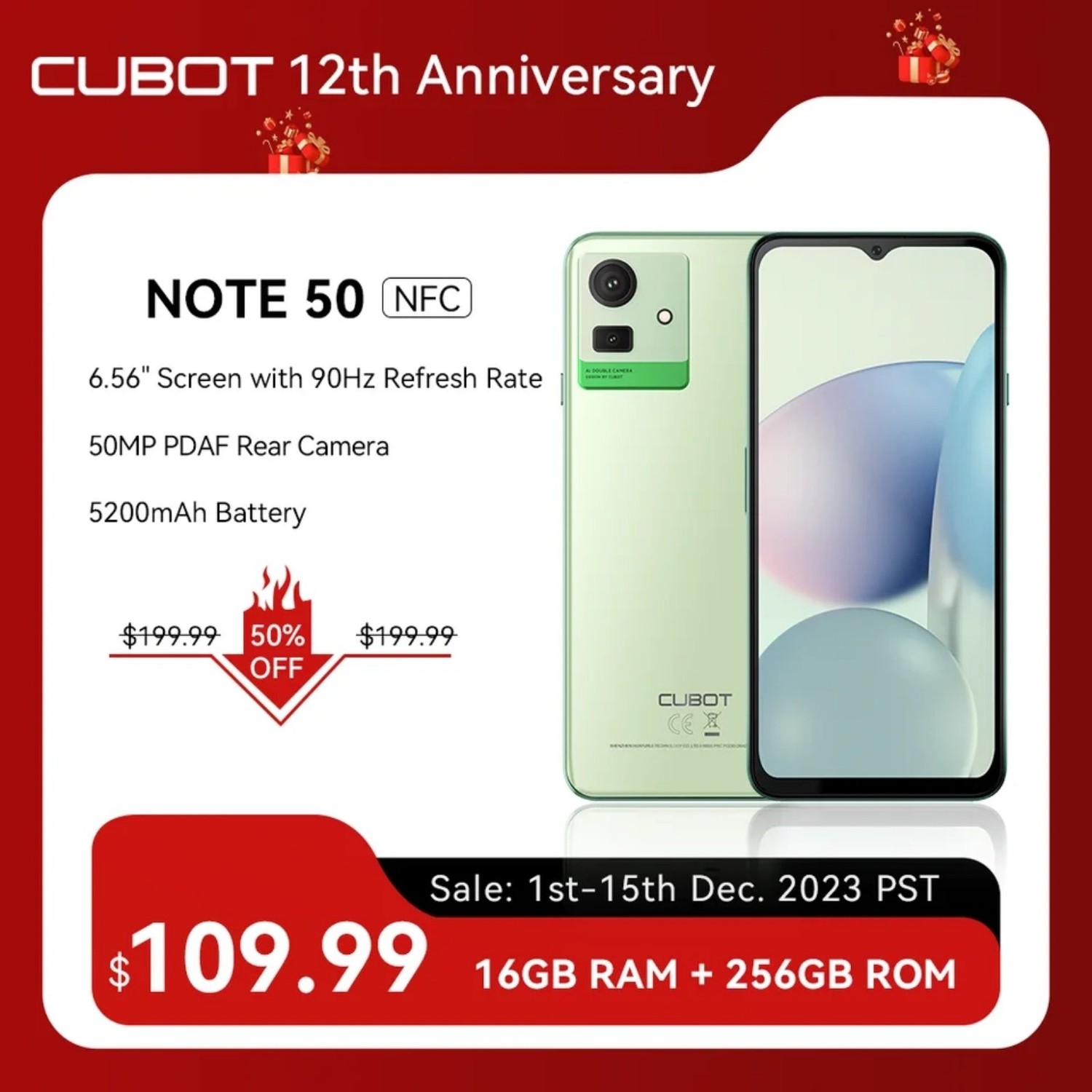 Восьмиядерный Смартфон Cubot NOTE 50, 16 ГБ ОЗУ (8 ГБ + 8 ГБ расширенной), 256 ГБ ПЗУ (расширение TF-карты на 1 ТБ), экран 6,56 дюйма, 90 Гц, NFC, камера 50 МП