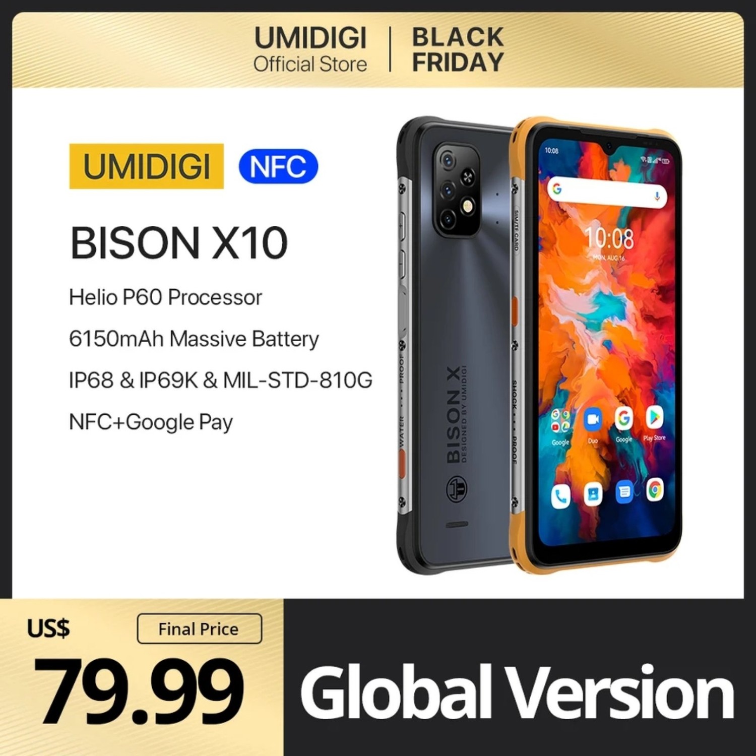 Смартфон UMIDIGI BISON X10 защищенный, IP68, Android, телефон, 4 Гб 64 ГБ, Восьмиядерный процессор Helio P60, экран 6,53 дюйма HD +, тройная камера 20 МП, 6150 мАч